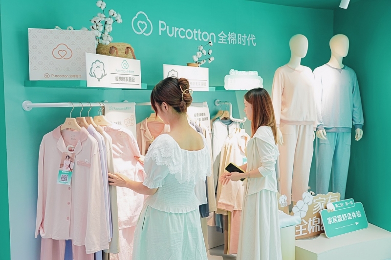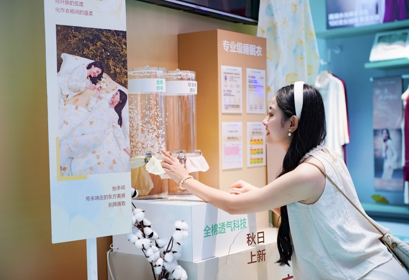 • 新品展陈区:360°环形呈现秋季系列家居服,从全棉华夫格到萌宠系列,从空气褶皱纱、水光棉系列,消费者可直接触摸面料质感并上身试穿。